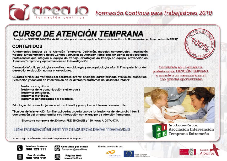 En el próximo mes de Mayo dará comienzo el curso de Atención Temprana de AREA 10 de 150 horas, acogido al decreto 151/2006, de 31 de Julio, por el que se regula el Marco de Atención a la Discapacidad en Extremadura (MADEX). En la organización de este curso ha colaborado AITE.